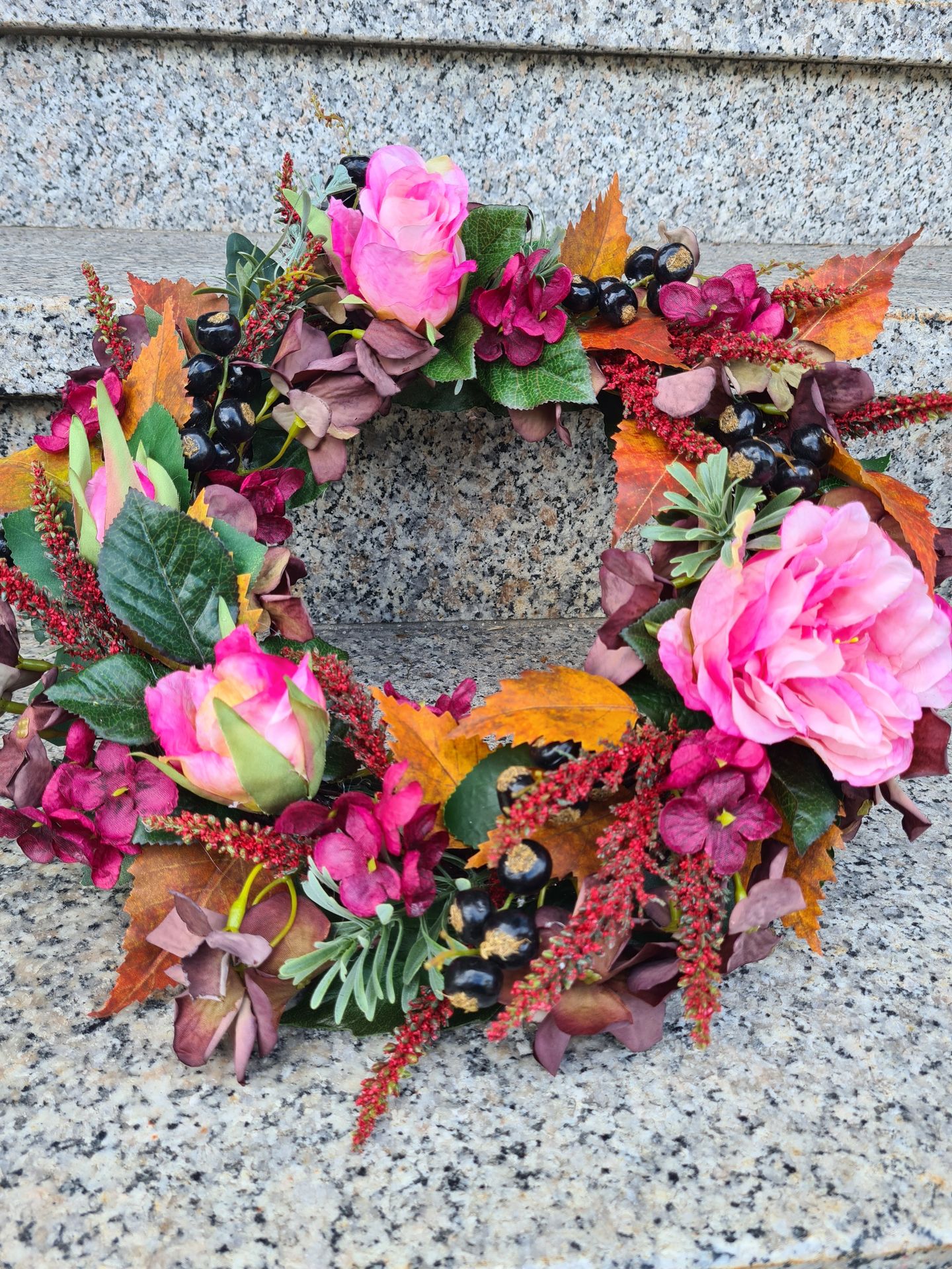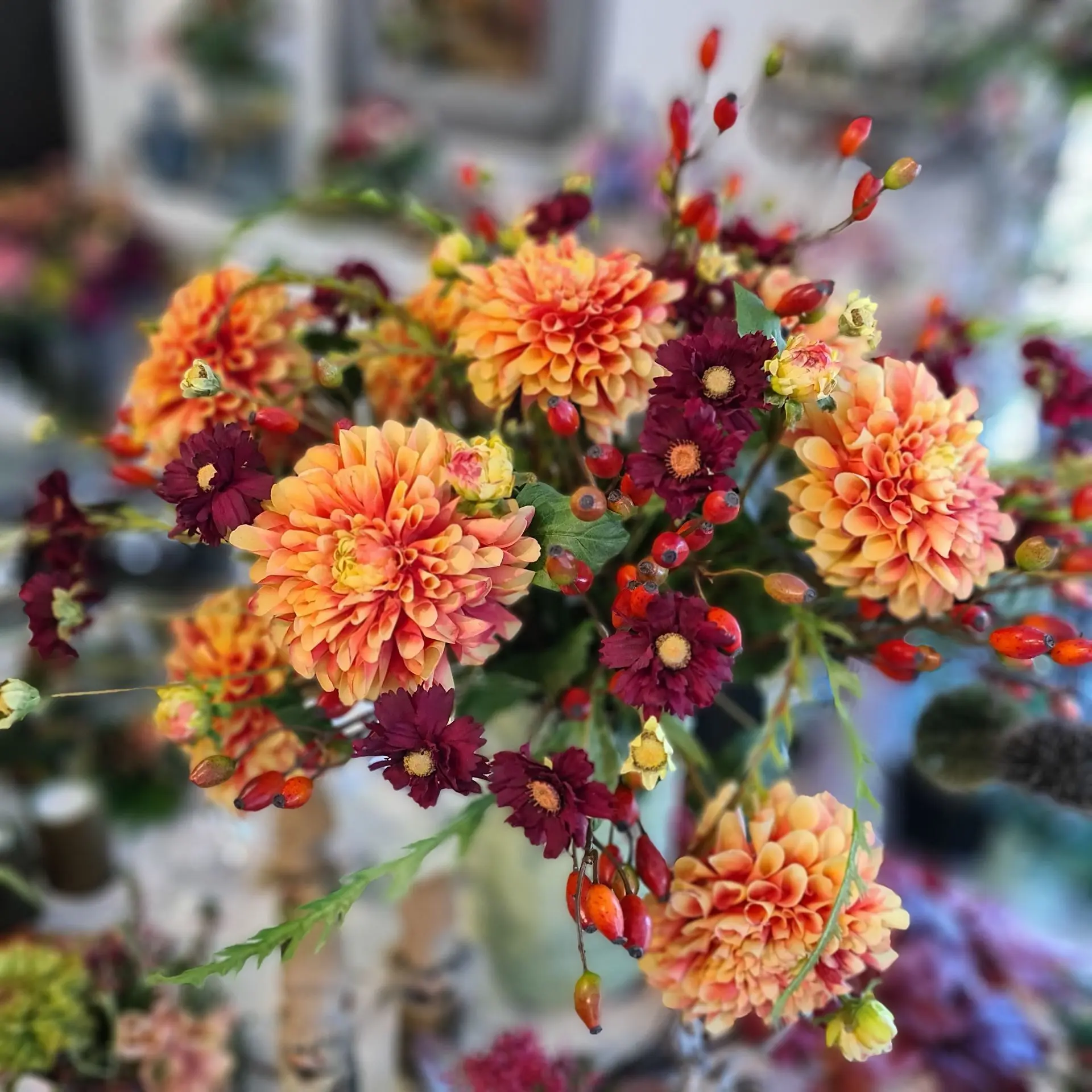 Beeren in lila, orange, rot, weiß und blau. Runde, dicke Dahlien und bunte Chrysanthemen mit fedrigen Gräsern und buntem Herbstlaub. Kürbisse, Zieräpfel und Lampions...